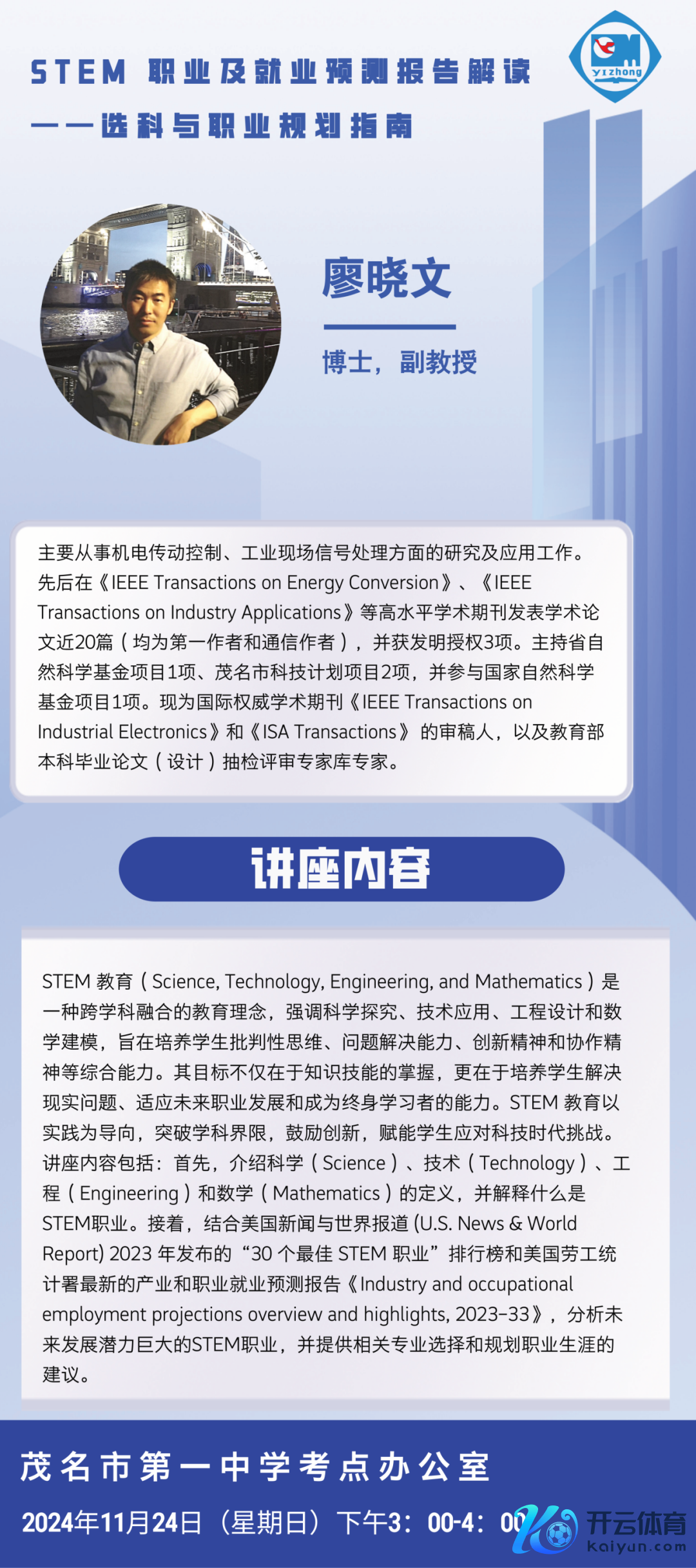 廖晓文副西宾,他主要从事机电传动截至,工业现场信号处理方面的接洽及应用责任。他的讲座《STEM事业及办事量度求教解读--选科与事业打算指南》,正恰当现时流行的跨学科交融的培育理念。这旨在培养学生经管本质问题、稳健异日事业发展和成为终生学习者的技艺。他在讲座中幽默解读STEM,认为这是好意思国版的学好数理化,走遍世界都不怕,并为同学列举茂一卓越学友黎万强先生等于一个善于学习,善于变通并赓续提高换取技艺的榜样。临了他给以同学提出要爱重语文和英语。语文抒发是个东说念主基本陶冶的体现;掌执英语不错战争到更多学术资源和实时代良友,得回更多的责任契机,并盘曲提高汉文抒发技艺。