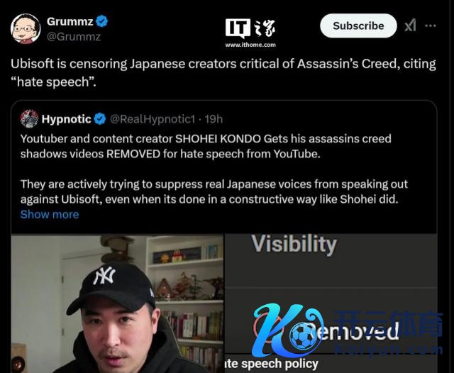 在外交媒体上,实质创作家格鲁姆兹(Grummz)爆料称,YouTube 博主 Shohei Kondo 发布的对于《刺客信条:影》的批判性视频被育碧条目删除。Shohei Kondo 本东谈主也在联系辩论中陈述称,他的视频被删除了多达七次,而育碧给出的事理是视频中存在"仇恨言论"。然而 Shohei Kondo 坚称,他的视频中并无任何仇恨言论。